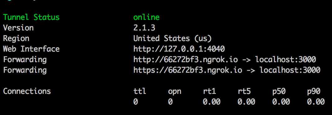 Step 3: Once the Tunnel Status is "online", the public URL http://66272bf3.ngrok.io will forward to your local server. Test that it works by testing this URL with a mobile browser or another computer.