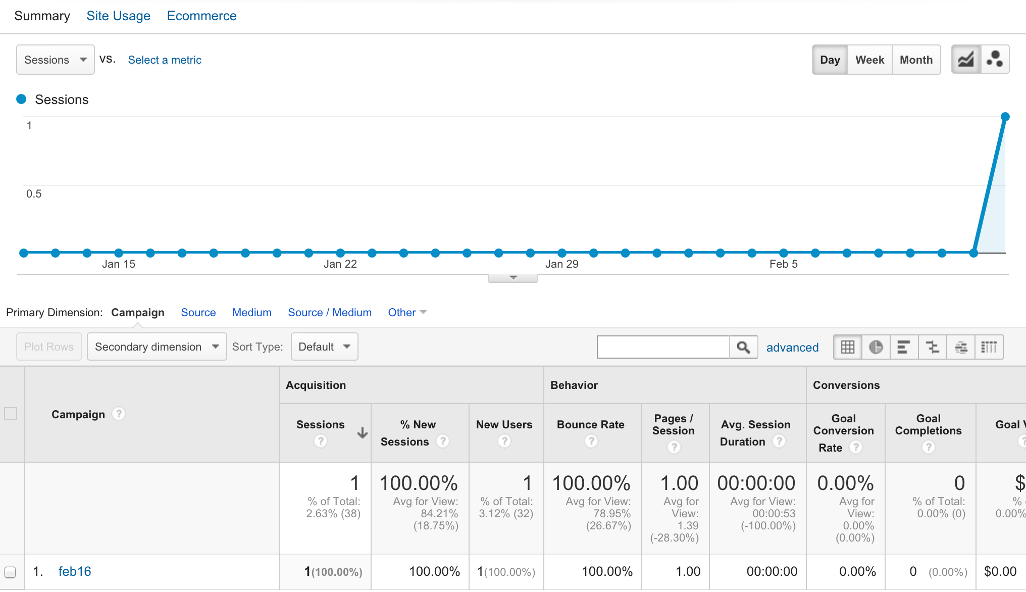 Since I clicked on this link and visited the site, the Campaigns report recorded that visit to the facebook feb16 campaign.