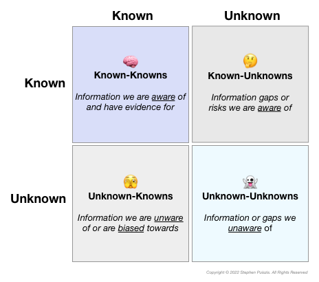 - Unknown-Unknowns: Information or knowledge gaps or risks that we are unaware of.