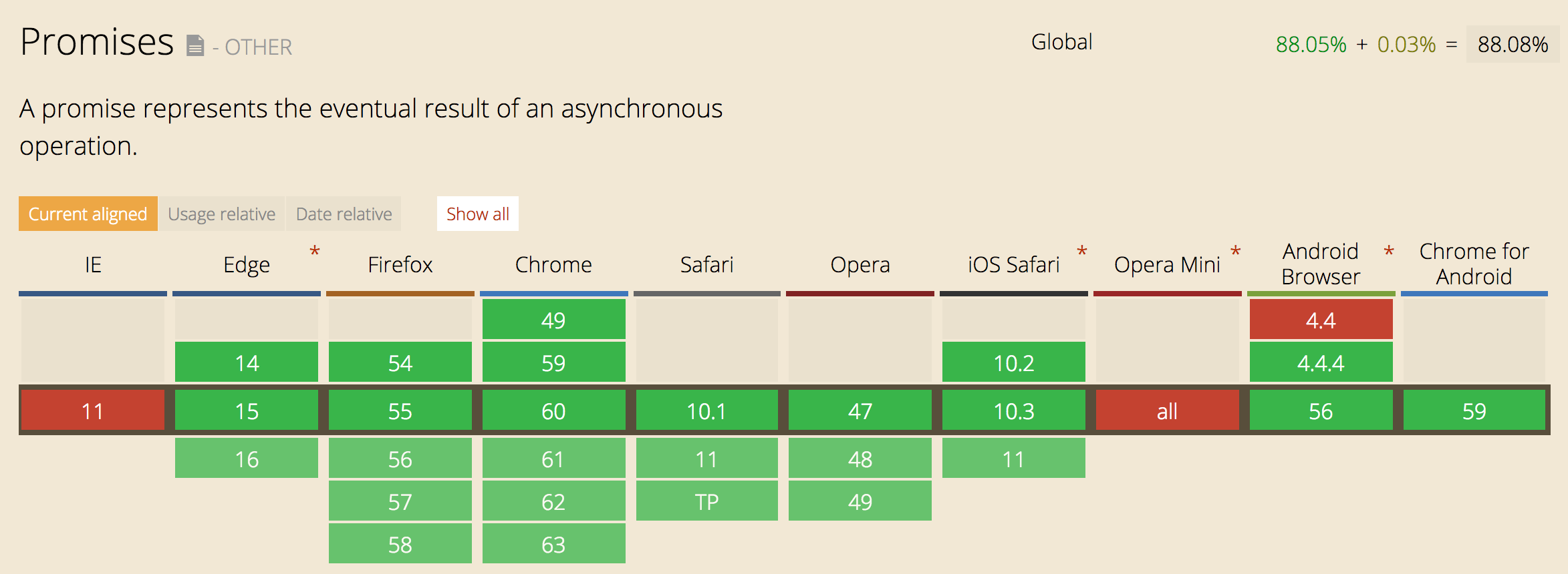 I encountered some errors recently writing JavaScript tests in Phantom.js: ReferenceError: Can't find variable: Promise. This seemed like a strange error and ultimately it turns out that phantom.js is significantly lagging behind overall browser support of JavaScript ES6 features, like Promises. As of this writing, all modern browsers support Promises, however Phantom won't support any ES6 features for quite some time. There are lots of other features not supported by Phantom.js, like Intl.js, the ECMAScript (ECMA-402) Internationalization API.